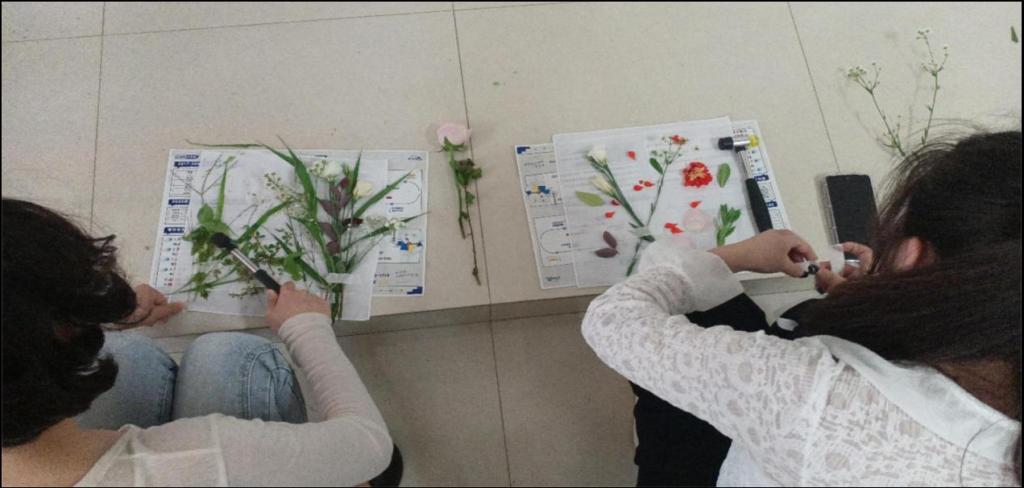 6月6日下午, 同学们于3教-305教室进行了本项活动,同学们将提前收集好的花材、叶材进行加工组合,形成能够表达自己内心期待的拓染作品。一花一世界,一叶一未来,活动过程中同学们既有小组合作完成的作品,也有独具个性的个人作品,作品充分展现了同学们的心理活动以及对美好未来的向往。