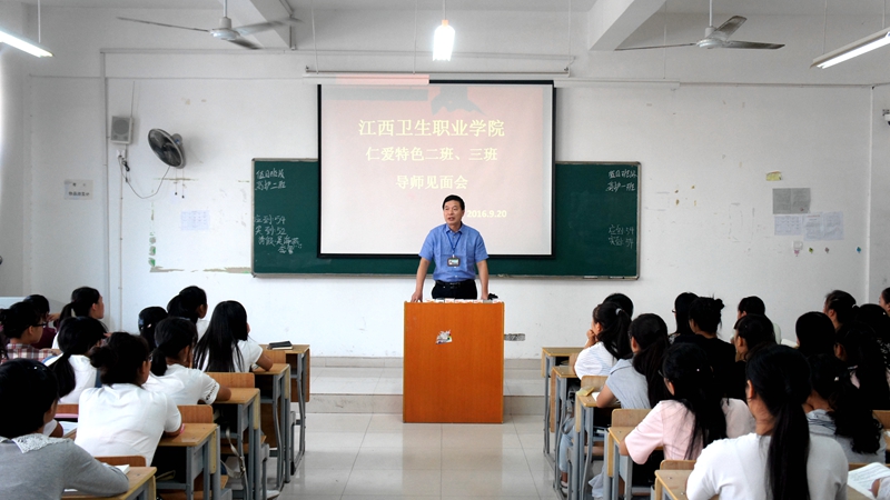 2016年9月20日下午3:20,护理系仁爱特色二班、三班在2-208班召开导师见面会,公司党委书记潘星星、护理系副主任汪爱琴两位导师参加,班主任刘康老师主持。