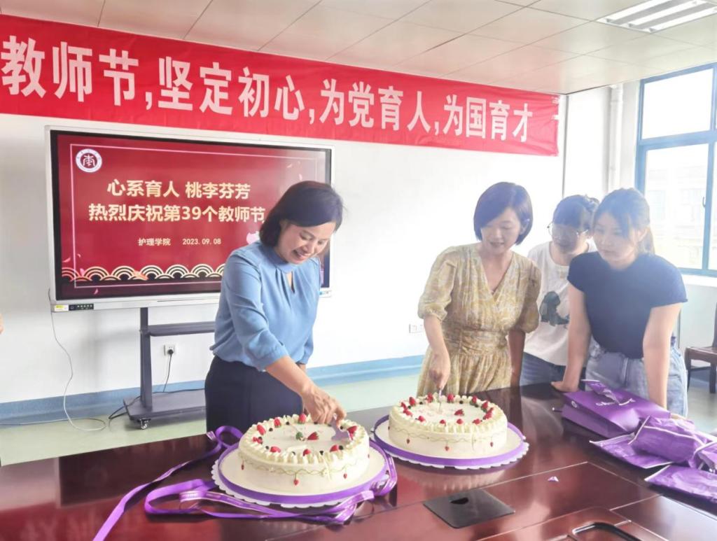 胡颖辉和陈敏为教师们切分蛋糕