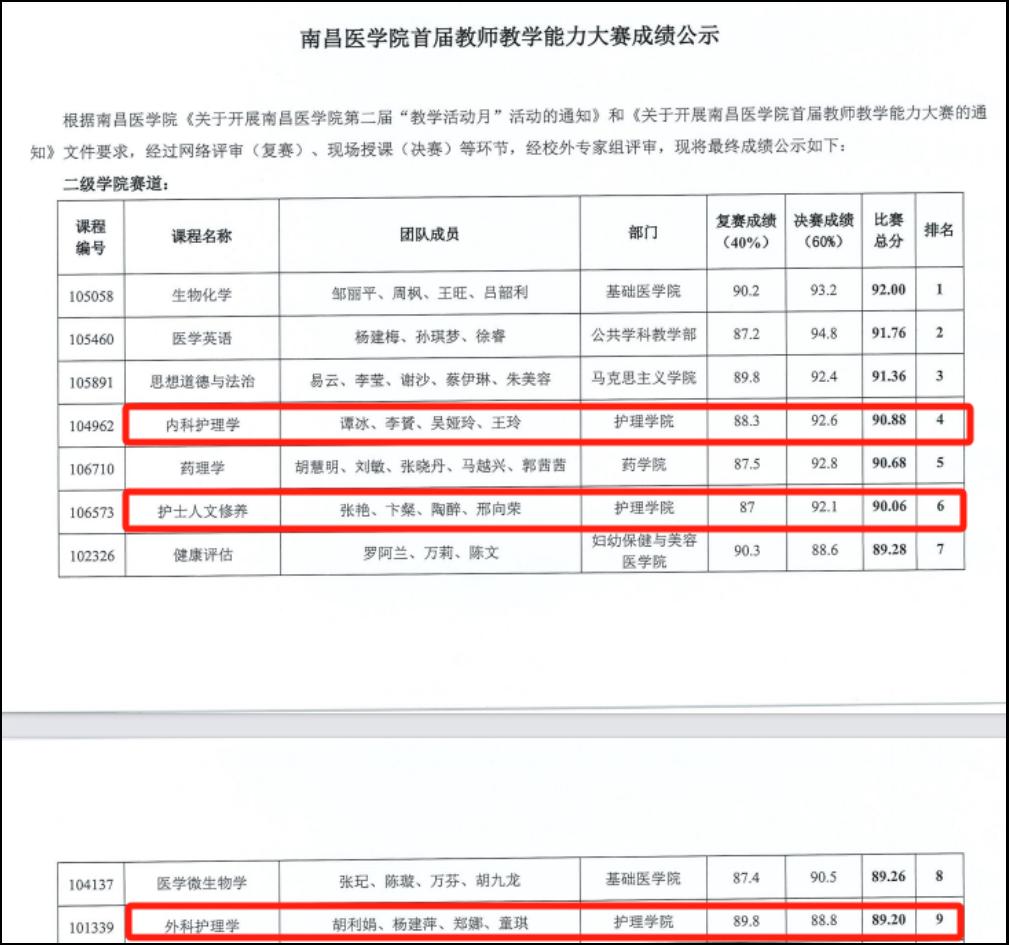 在首届教师教学能力大赛中,BB贝博艾弗森谭冰等老师的《内科护理学》课程团队、张艳等老师的《护士人文修养》课程团队、胡利娟等老师的《外科护理学》课程团队分别取得第四名、第六名和第九名的佳绩。