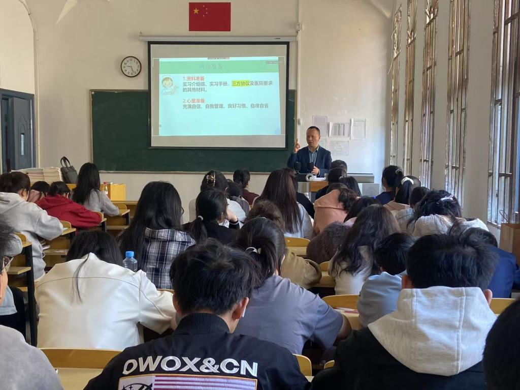 最后,沈林做实习重要性讲话,他叮嘱同学们,从公司到医院,学会熟练运用自己的专业技能,完成从理论到实践的角色转变;严格遵守医院规章制度,保持积极主动的学习态度,学会面对困难与挑战;同时,沈林从四个方面指出了同学们需要努力的方向,帮助同学们明晰自己的目标,用饱满的热情为同学们加油鼓劲。